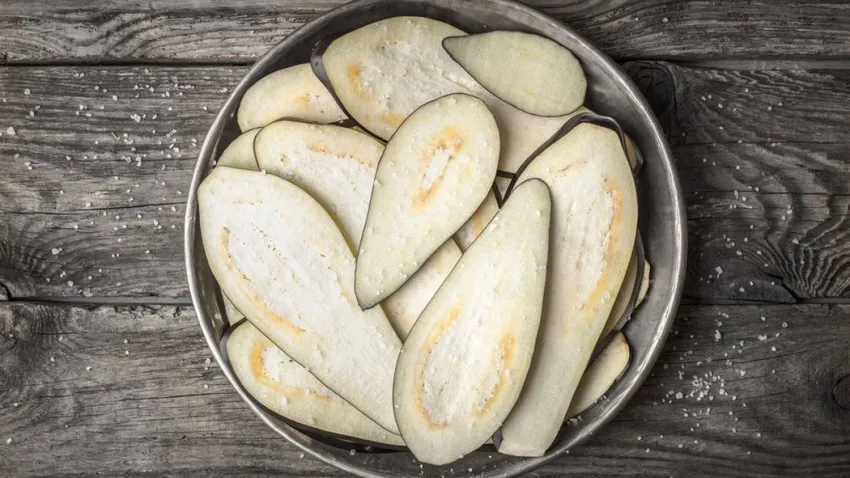 - Para quitar el amargor a la berenjena, primero lamínala finamente.
