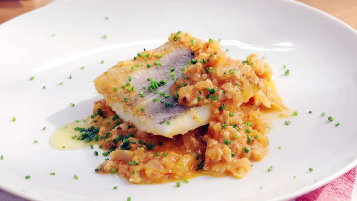 Sirve el bacalao con la salsa de almendras, decora con cebollino.