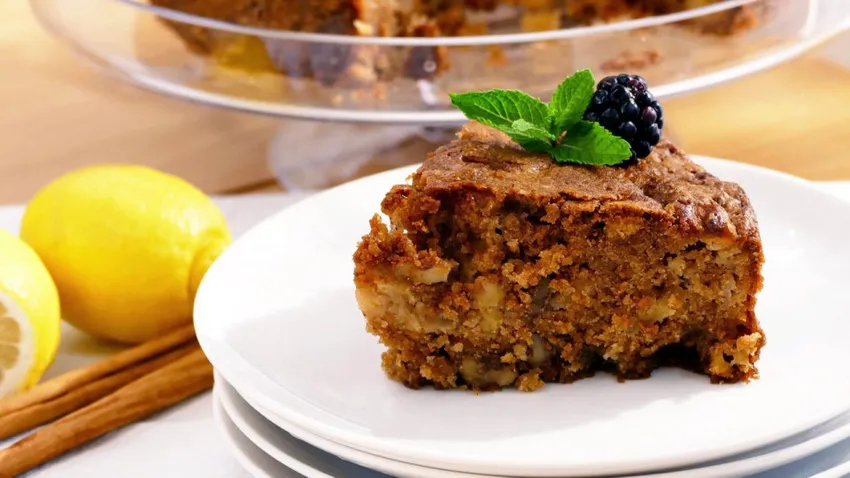 Bizcocho casero de manzana y nueces con un toque de canela, perfecto para acompañar el café.