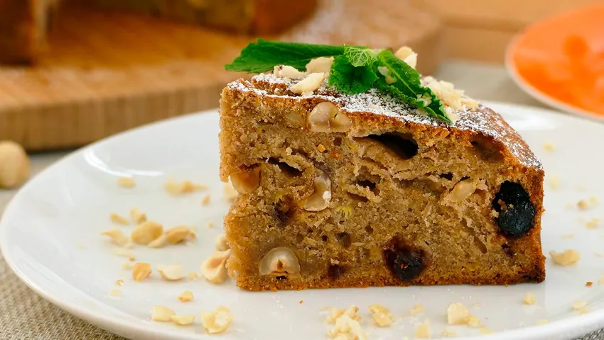 Sirve el bizcocho de plátano, avellanas y arándanos.