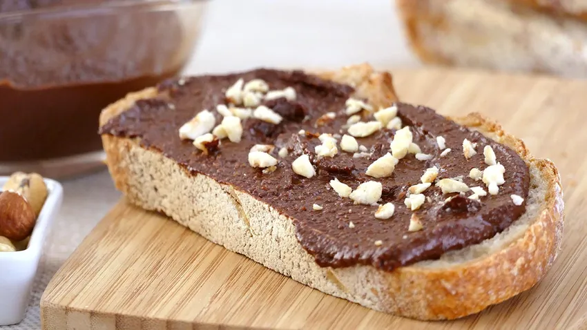 Sirve la crema de cacao y avellanas sin azúcar. Puedes untarla en una rebanada de pan y espolvorear con avellanas picadas.