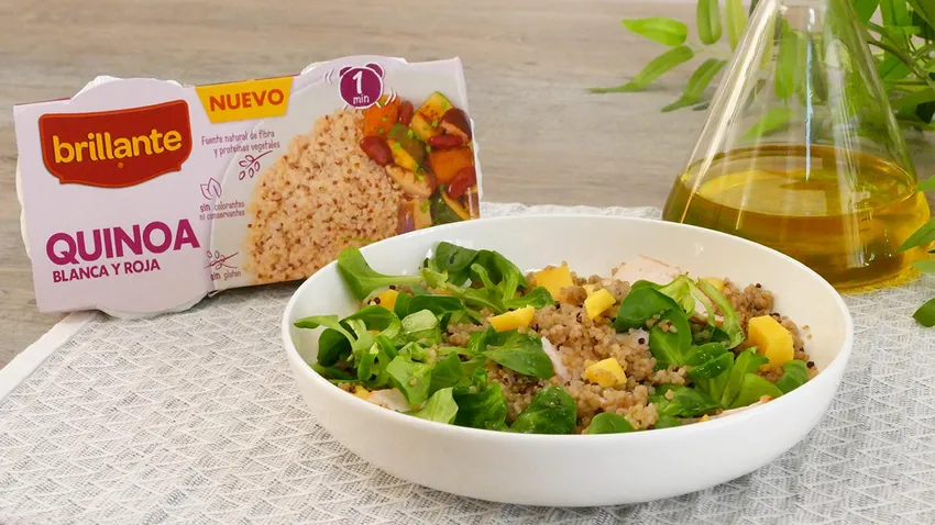 Os proponemos una receta fácil y rápida para preparar una original y refrescante ensalada con canónigos, pollo cocido o asado , mango y quinoa. Os descubrimos los prácticos vasitos de quinoa blanca y roja para completar vuestras recetas. ¡Ensalada lista en 15 minutos!