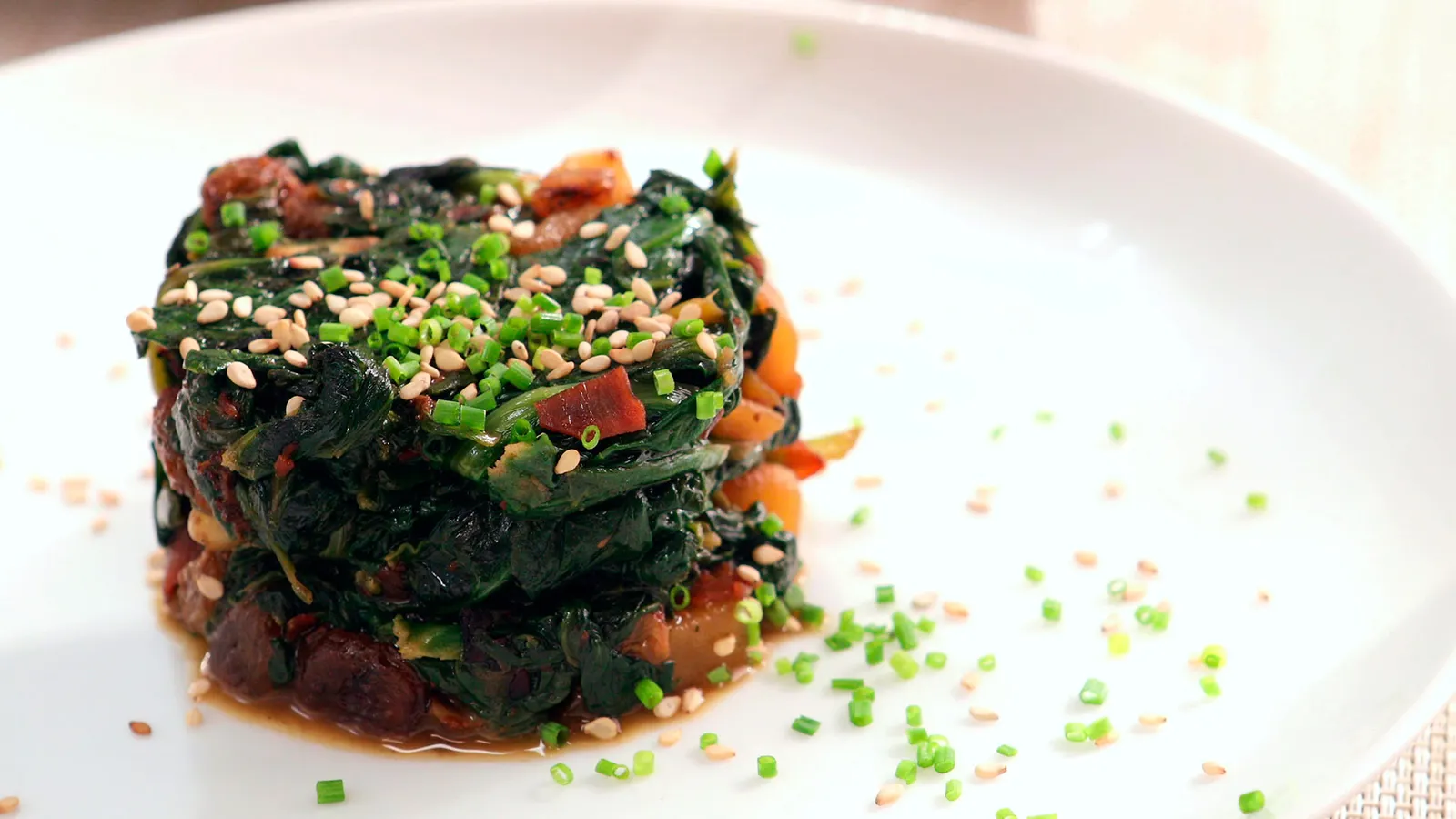 Para emplatar las espinacas, colócalas en un plato dentro de un cortapastas redondo para darles forma. Retira el cortapastas, espolvorea con semillas de sésamo y cebollino picado.