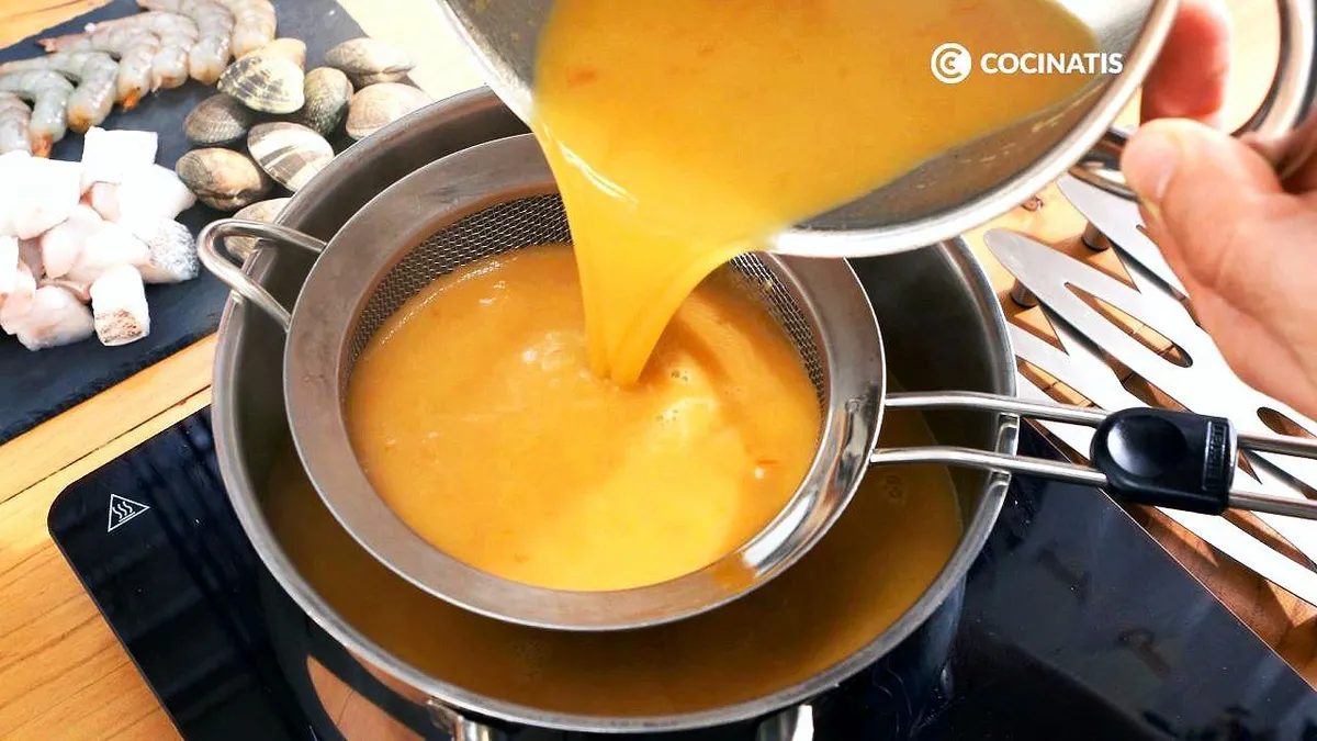 Llegado el momento pasa el fumet por un colador de maya fina a otra olla o recipiente para eliminar las partes sólidas.