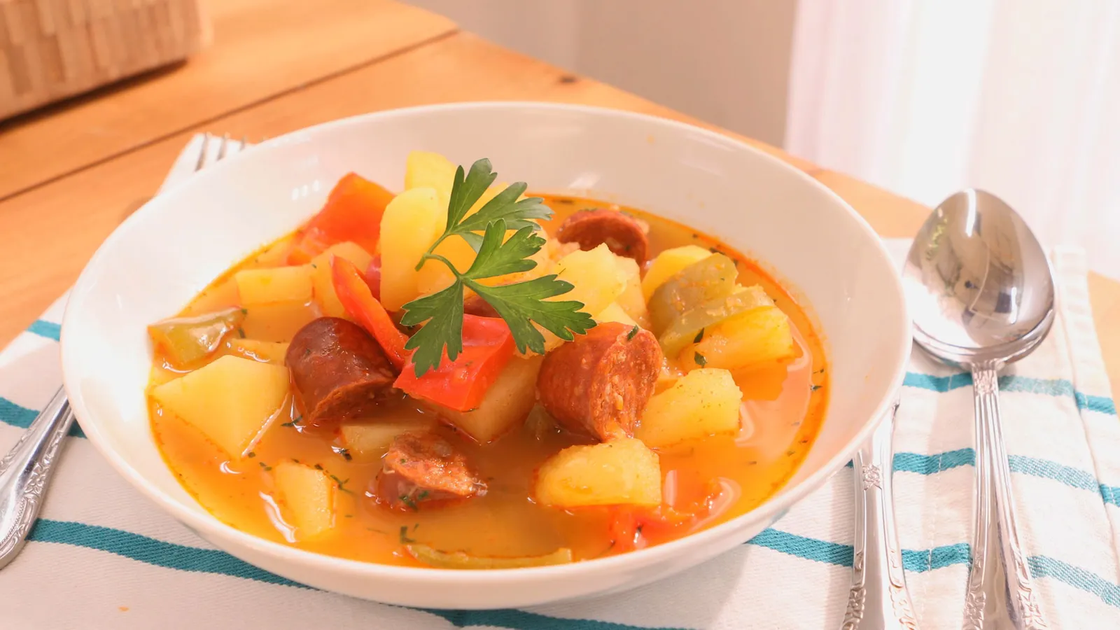 Aprende a elaborar este delicioso guiso de patatas con verduras y chorizo.