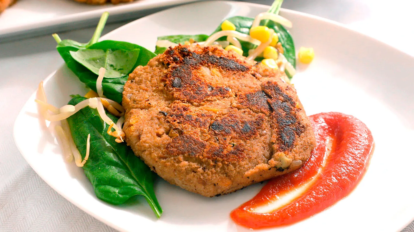 Sirve las hamburguesas de lentejas. Puedes acompañarlas con salsa de ketchup y guarnición de ensalada.