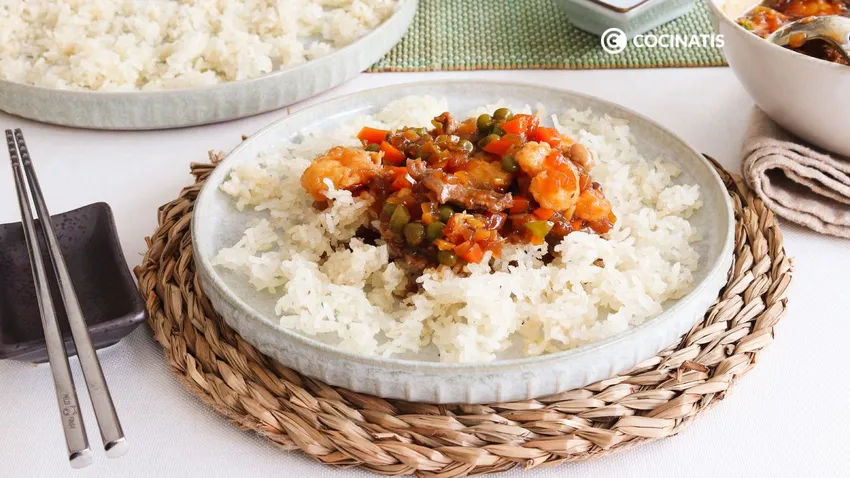 Para espesar la salsa, diluye 1 cucharada de maicena en un poco de agua y añádela a la salsa llevándola a ebullición. Cocina un par de minutos más, incorpora las gambas y la carne, y mantén la salsa a fuego mínimo mientras terminas el arroz.