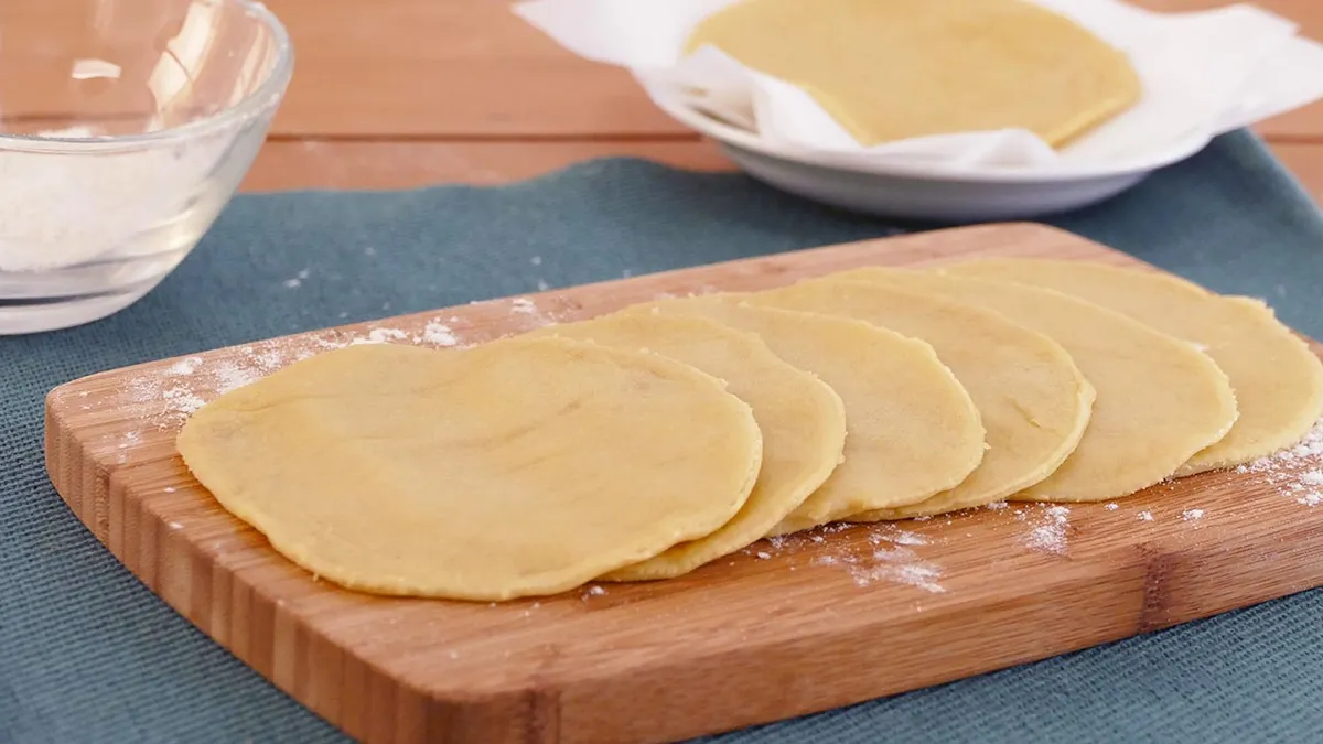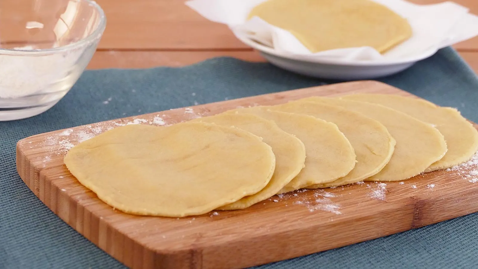 Enharina una superficie lisa y coloca la masa encima. Amasa y córtala en pequeñas bolas. Estira cada bola de masa con el rodillo y para darle forma de oblea, pon un bol encima y marca el contorno con un cuchillo. Retira la masa sobrante y repite el proceso hasta acabar con la masa.