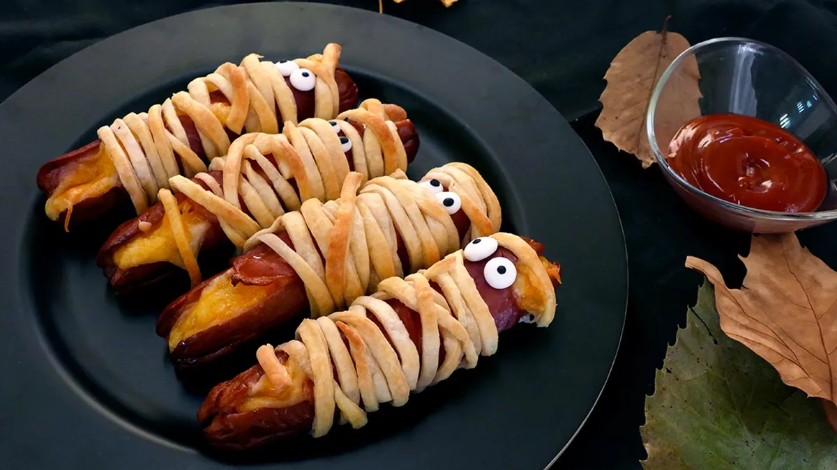 Coloca los ojos entre las vendas y sirve las salchichas momia para Halloween.