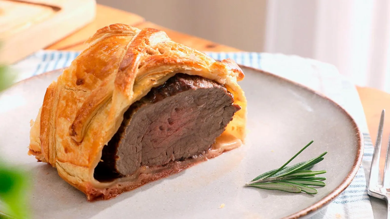 Sirve el solomillo Wellington y decora con una ramita de romero. Si queréis darle un extra de sabor, probad en acompañarlo con el popular puré de castañas, ¡está buenísimo!