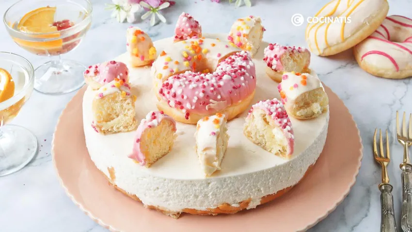Se trata de una tarta sin horno, muy fácil de preparar, que combina lo mejor de los Donuts con una textura cremosa similar a la de una tarta de queso fría. El sabor a Donut se mantiene presente en cada bocado, pero sin resultar empalagosa.