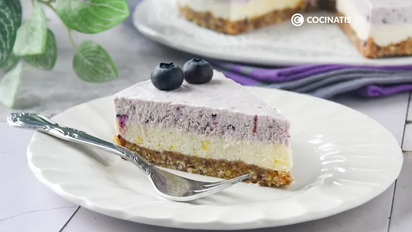 A diferencia de otras tartas de queso sin horno, para esta versión preparamos una base con frutos secos y dátiles, que convierte esta tarta en apta para celíacos o personas que no toman gluten. Y, además, esta base combina a la perfección con la suavidad de las capas de limón y arándanos.